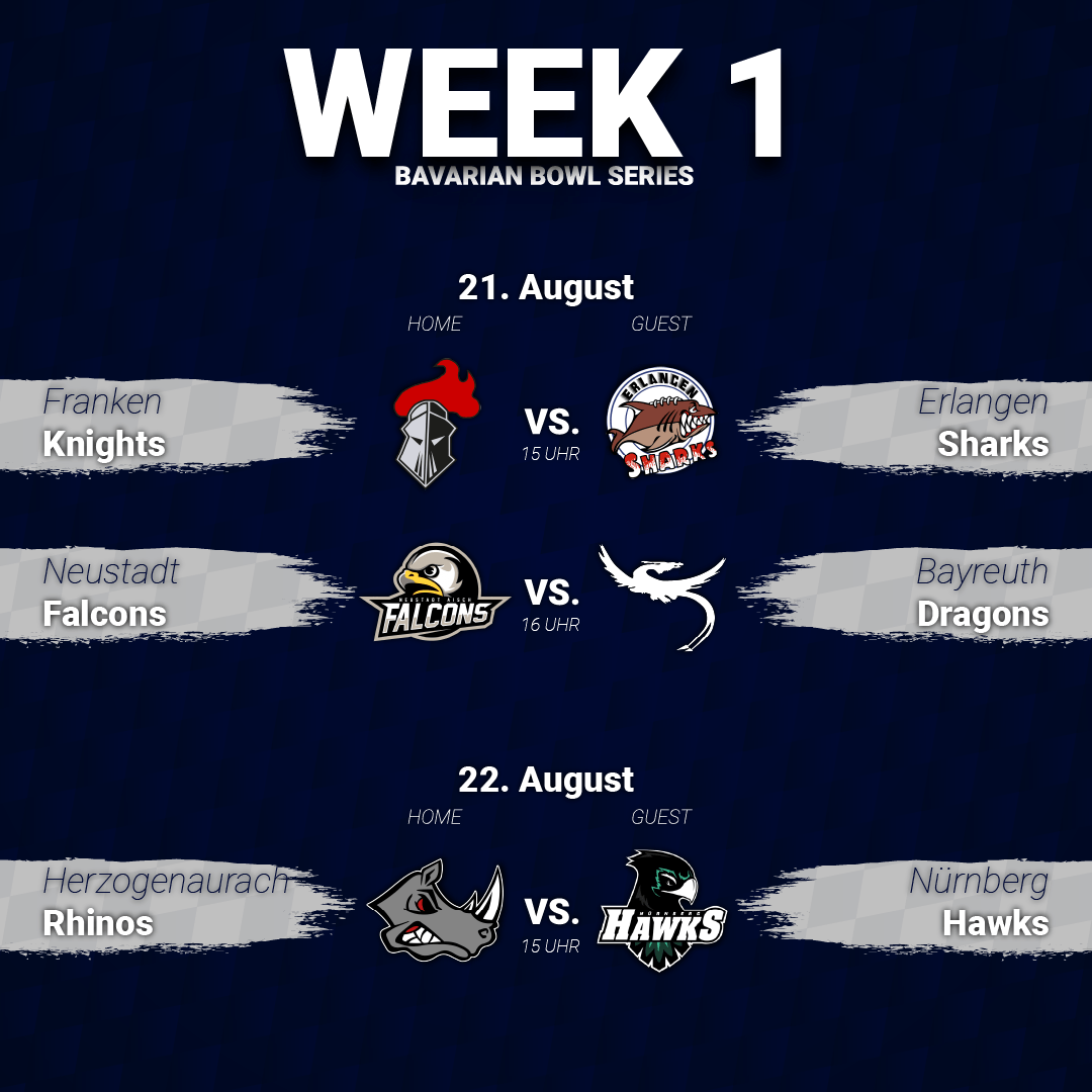 Am Sonntag, den 23. April 2023, fand das erste Spiel der Neustadt Falcons in der Bayernliga gegen Dachau Thunder statt. Bereits im zweiten Drive der Neustädter Offensive brachte Siegfried Wicht die Falcons mit einem Touchdownlauf zum 6:0 auf die Erfolgsspur. Die starke Neustädter Defensive konnte in der ersten Halbzeit alle Versuche der Hausherren Raumgewinn zu erzeugen frühzeitig stoppen und provozierte einige Ballverluste. So bekam die Offensive immer wieder die Chance Punkte zu erzielen, doch erst kurz vor dem Halbzeitpfiff konnte Oliver Axmann nach einem Pass vom Quarterback Luca Gonter auf 12:0 stellen. Nach erfolgreichem Extrapunkt ging es mit 13:0 in die Halbzeit. Direkt nach der Halbzeit sollte sich dann auch die Defense für ihre harte Arbeit belohnen. Direkt im ersten Spielzug nach dem Wiederanpfiff konnte Franz Huber den Pass des gegnerischen Quarterbacks schnappen und zum 19:0 in die Endzone tragen. Nur zwei Spielzüge später war es dann erneut Franz Huber der ein Déjà-vu erlebte und beim gleichen Spielzug der Offense erneut den Ball abfangen und in die Endzone tragen konnte. Durch den Extrapunkt stellte Oliver Axmann dann auf 26:0. Kurz vor Schluss punkteten dann auch noch die Gastgeber nach einem langen Pass in die Endzone und stellten damit den Endstand von 26:6 her. Für die Falcons soll dies nur ein kleiner Vorgeschmack auf die erste Bayernligasaison gewesen sein. Direkt am kommenden Samstag den 29.04. geht es an der Weißen Marter um 15 Uhr weiter mit einem Heimspiel gegen die Königsbrunn Ants, welche mit zwei Siegen gegen die Nürnberg Hawks und die Starnberg Argonauts in die Saison starteten.